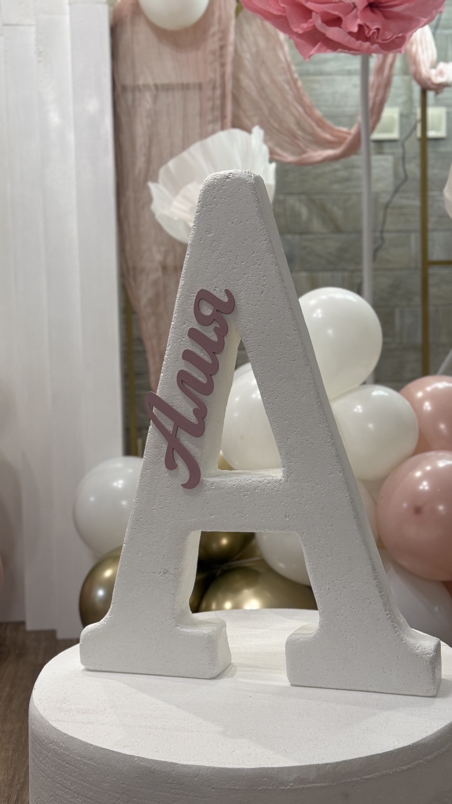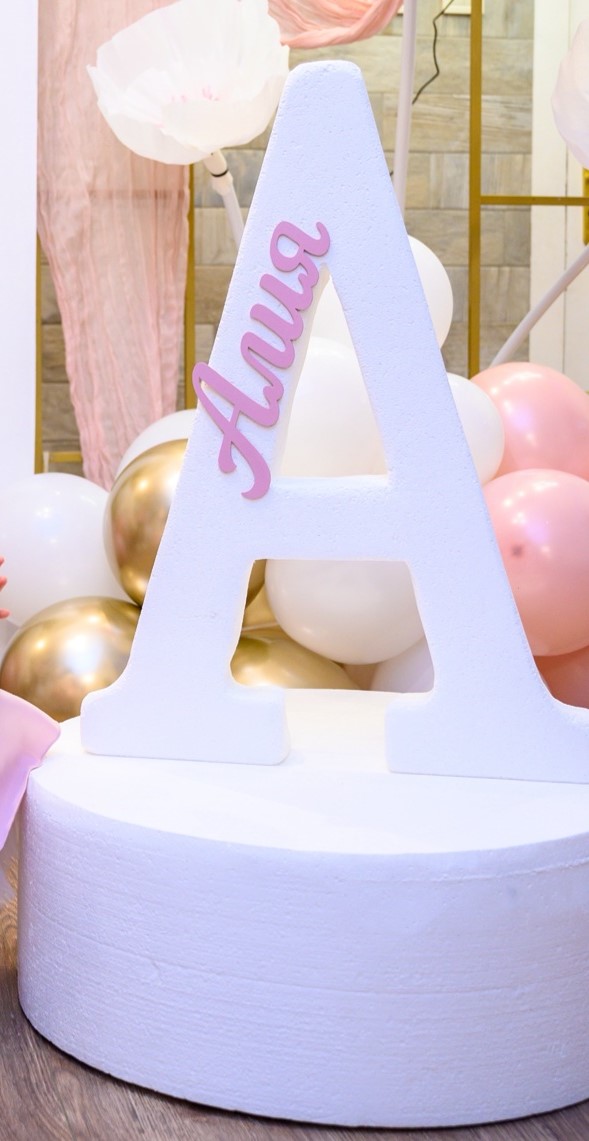 Елегантна парти декорация, съчетаваща голяма бяла буква A с персонализиран розов надпис която служи като основен акцент в празничната визия.