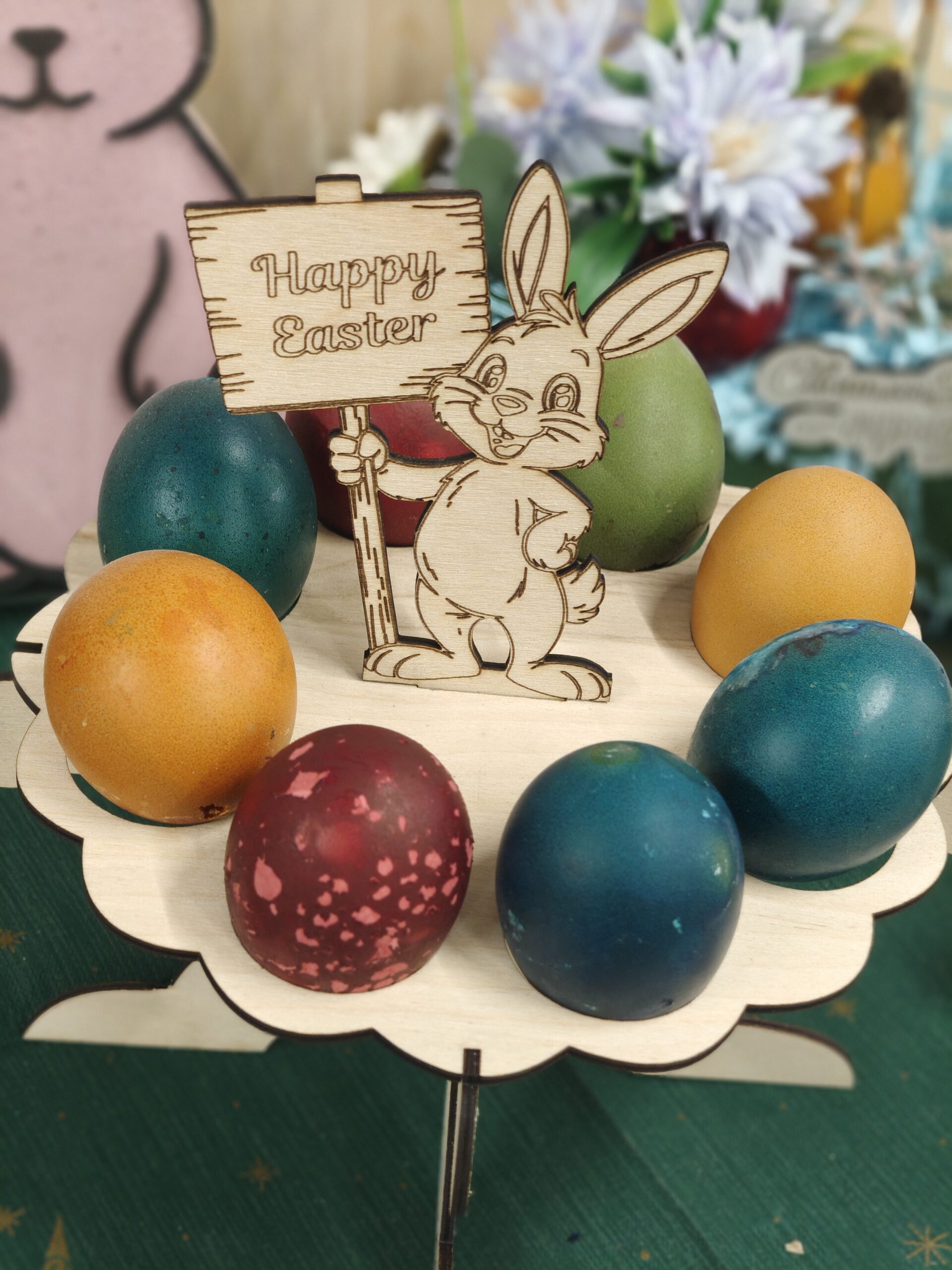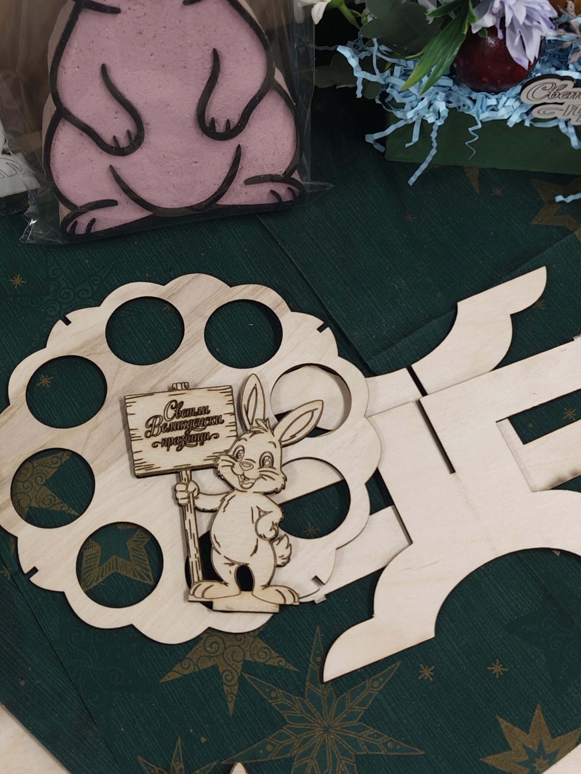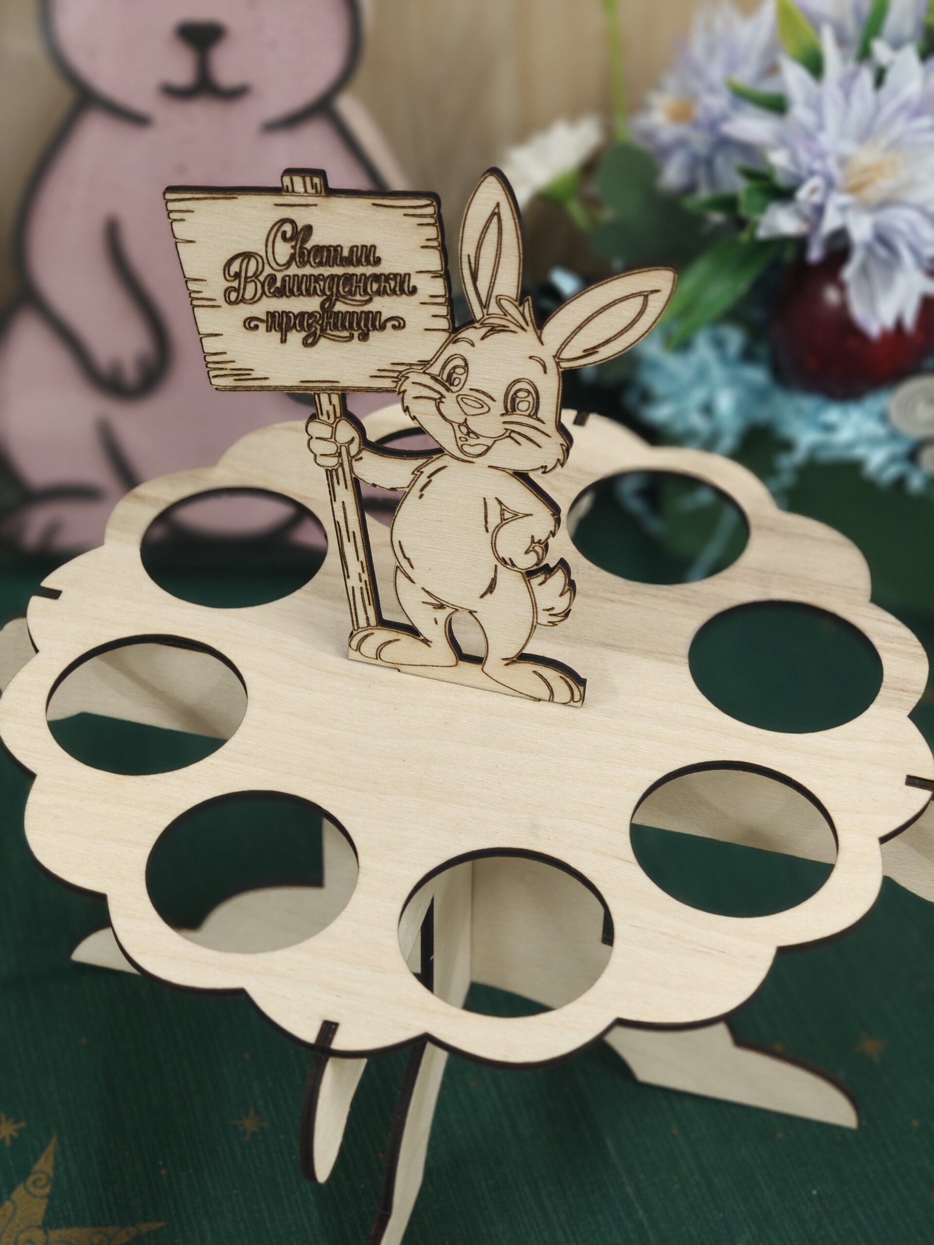 Празнична дървена поставка за великденски яйца, изработена с фини лазерни детайли. В центъра е разположено усмихнато зайче, което държи табелка с надпис „Светли Великденски празници“. Около него има места за подреждане на боядисани яйца, което я прави идеална за празничната маса или за украса на дома.