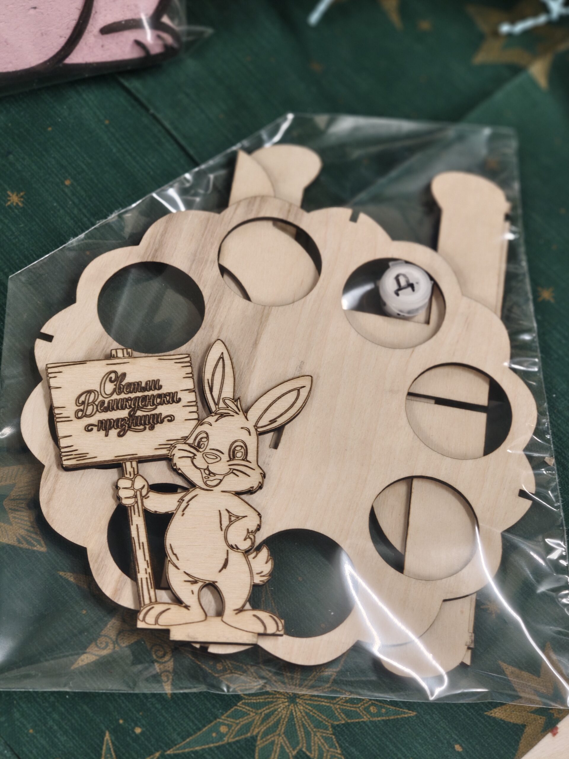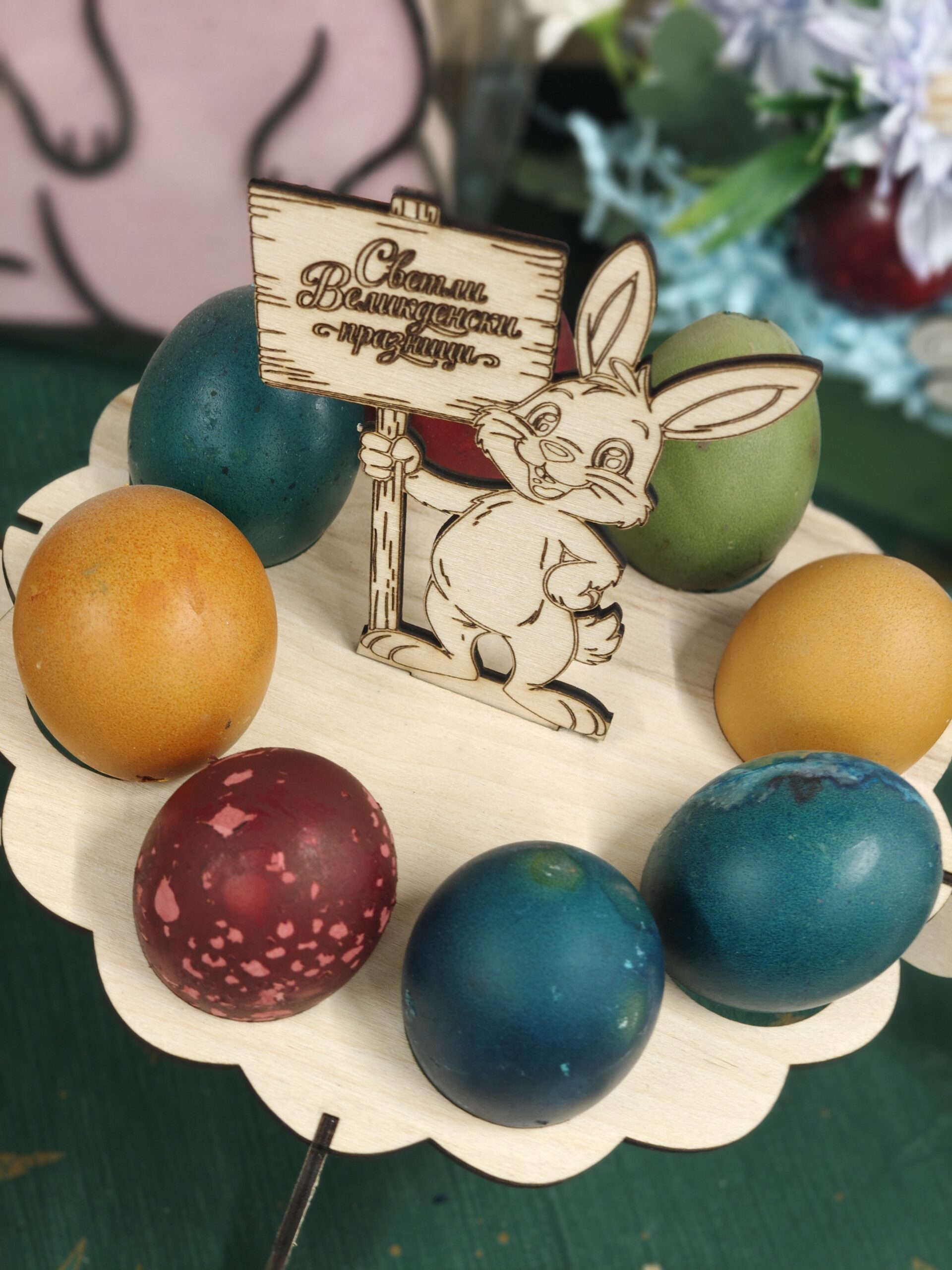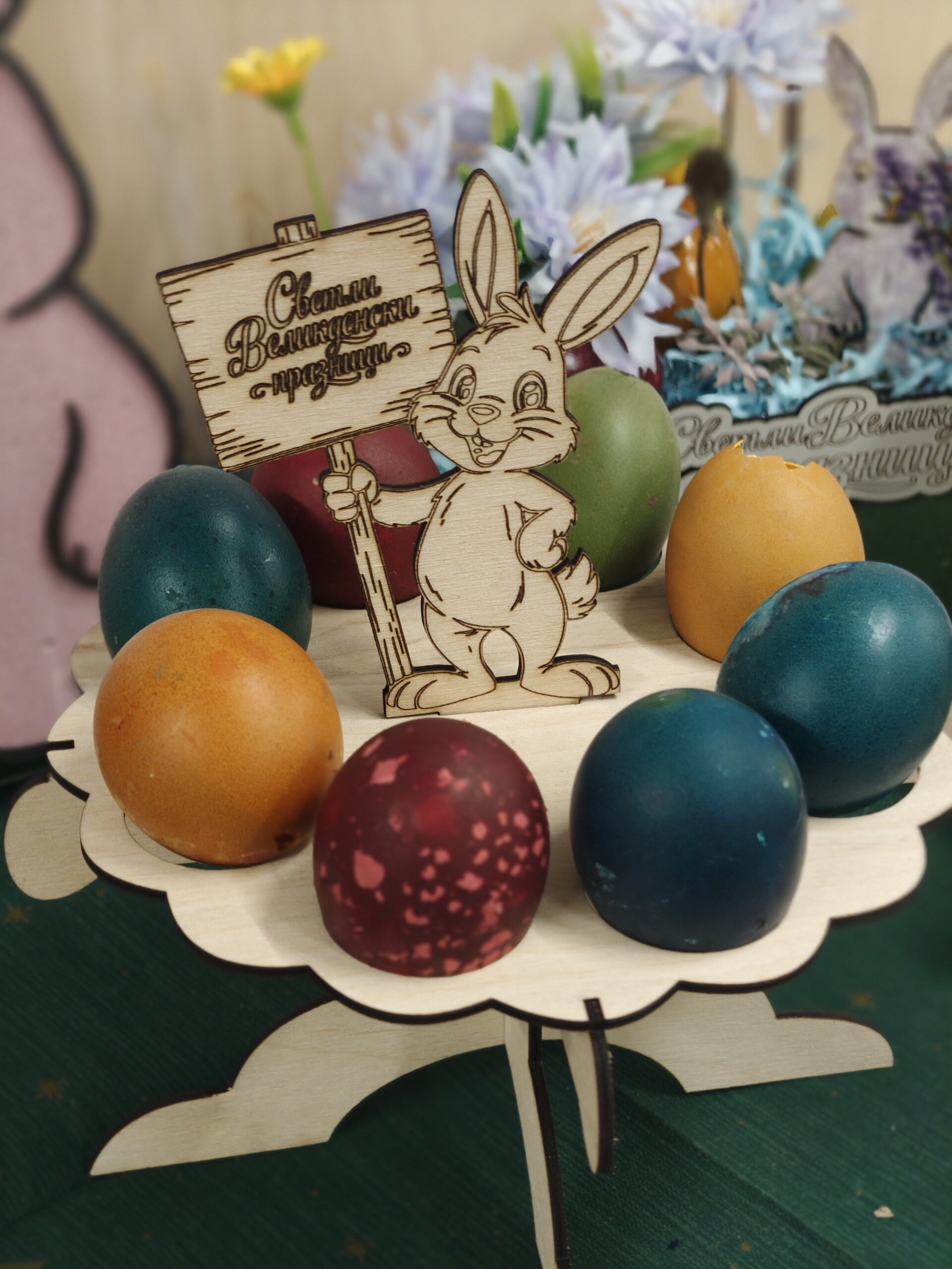 Празнична дървена поставка за великденски яйца, изработена с фини лазерни детайли. В центъра е разположено усмихнато зайче, което държи табелка с надпис „Светли Великденски празници“. Около него има места за подреждане на боядисани яйца, което я прави идеална за празничната маса или за украса на дома.