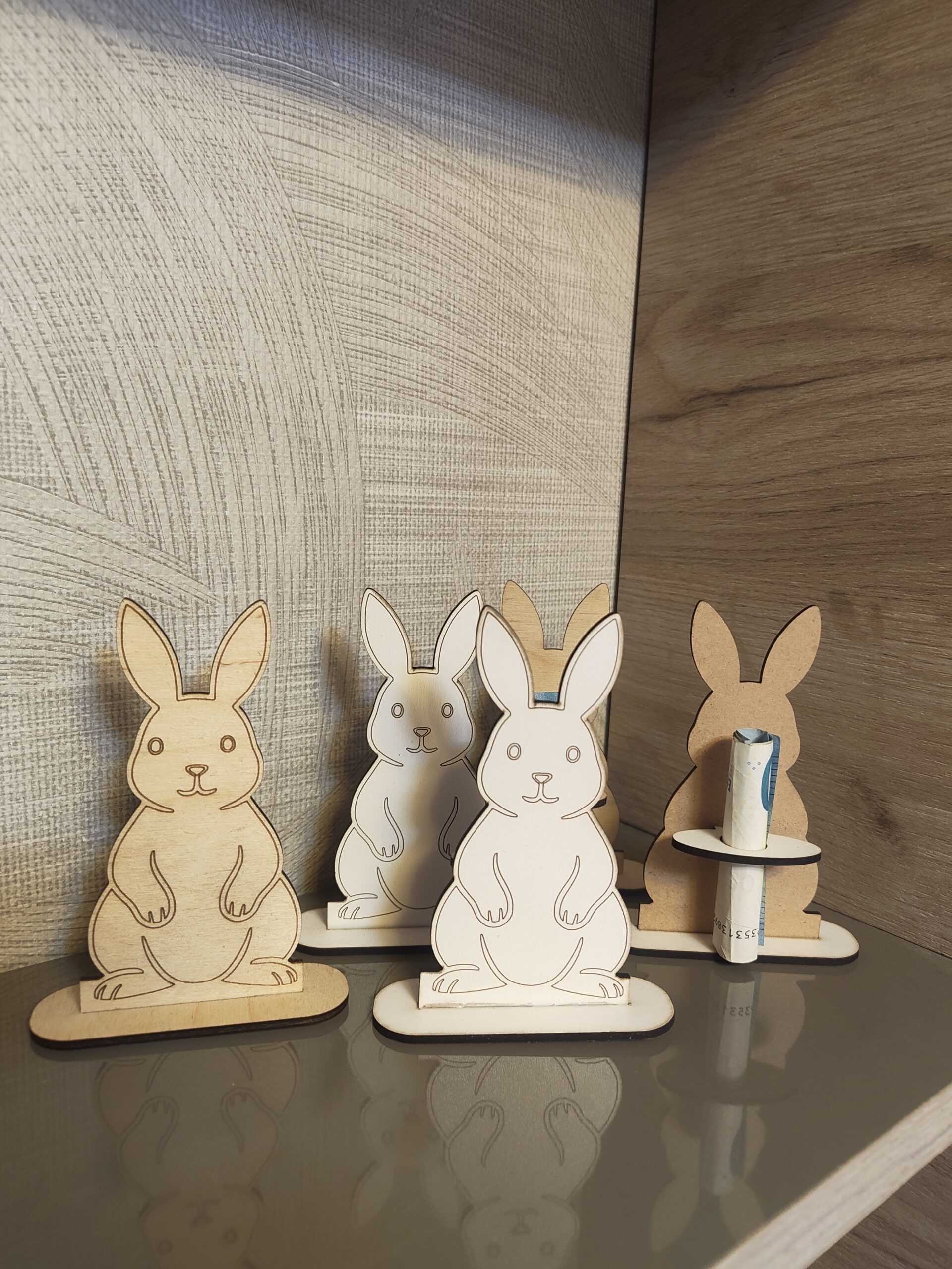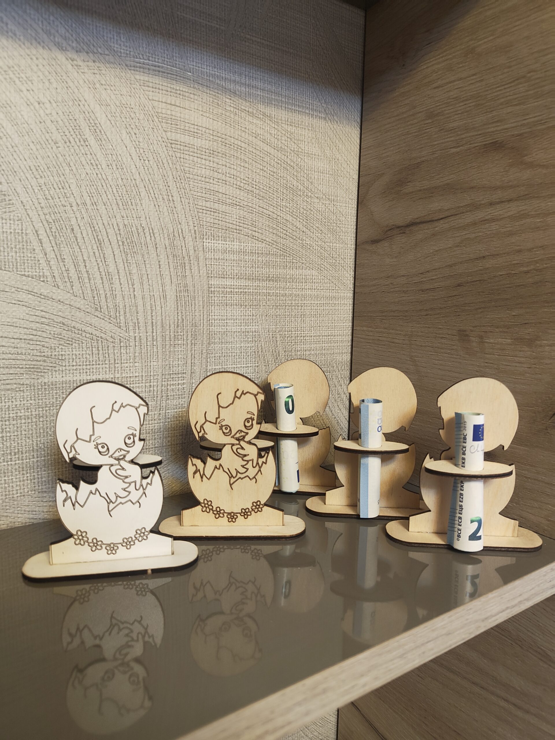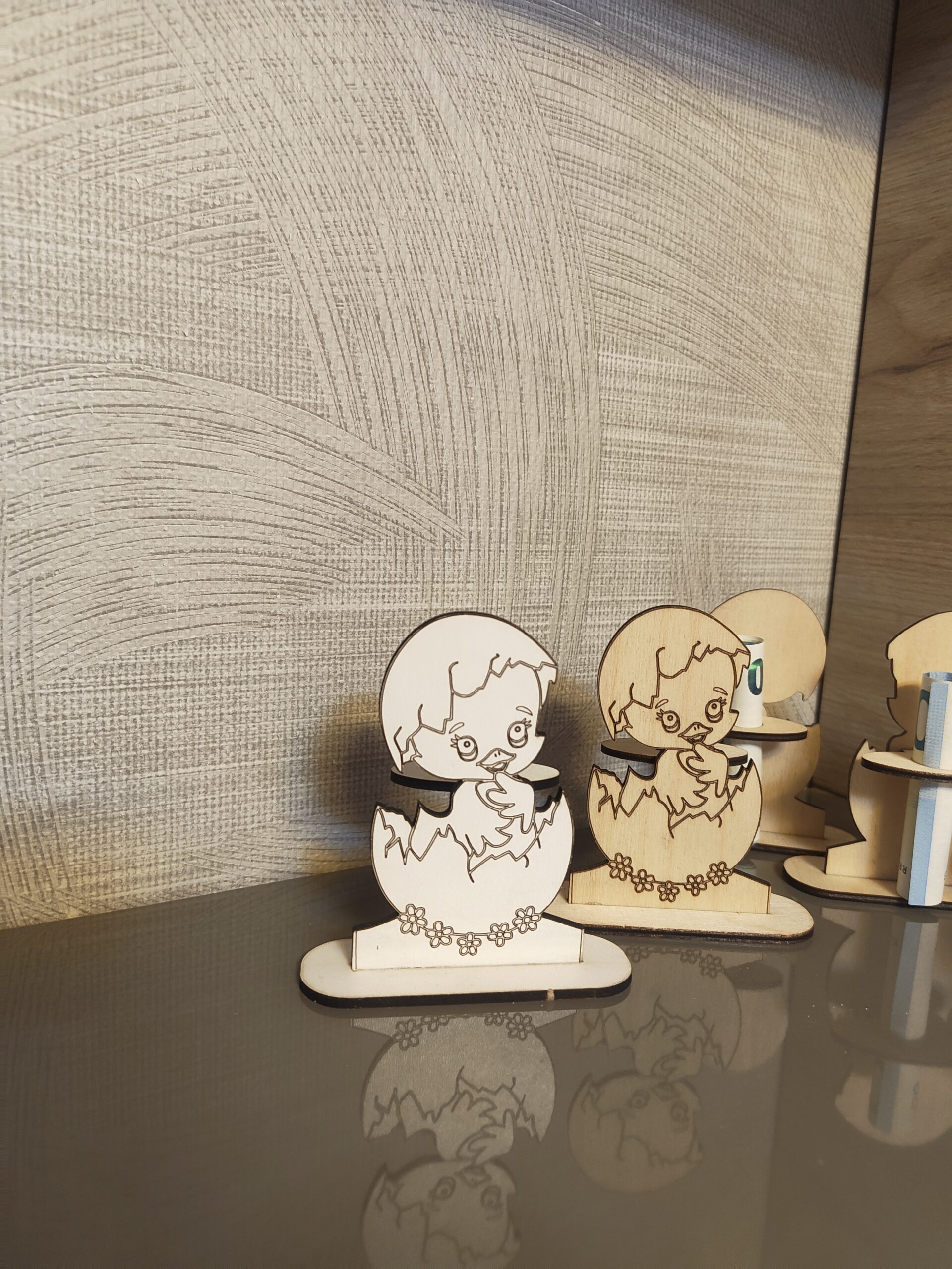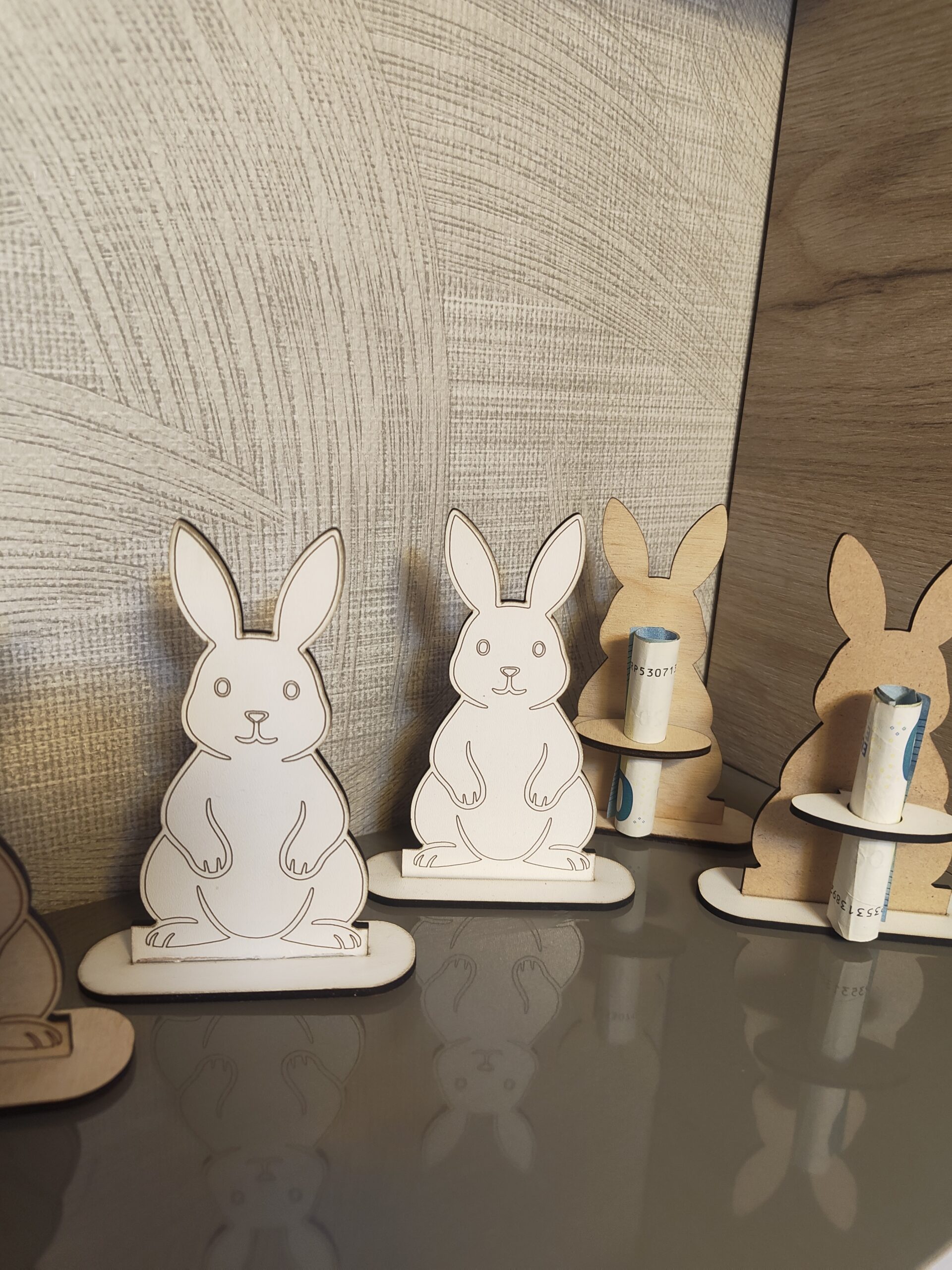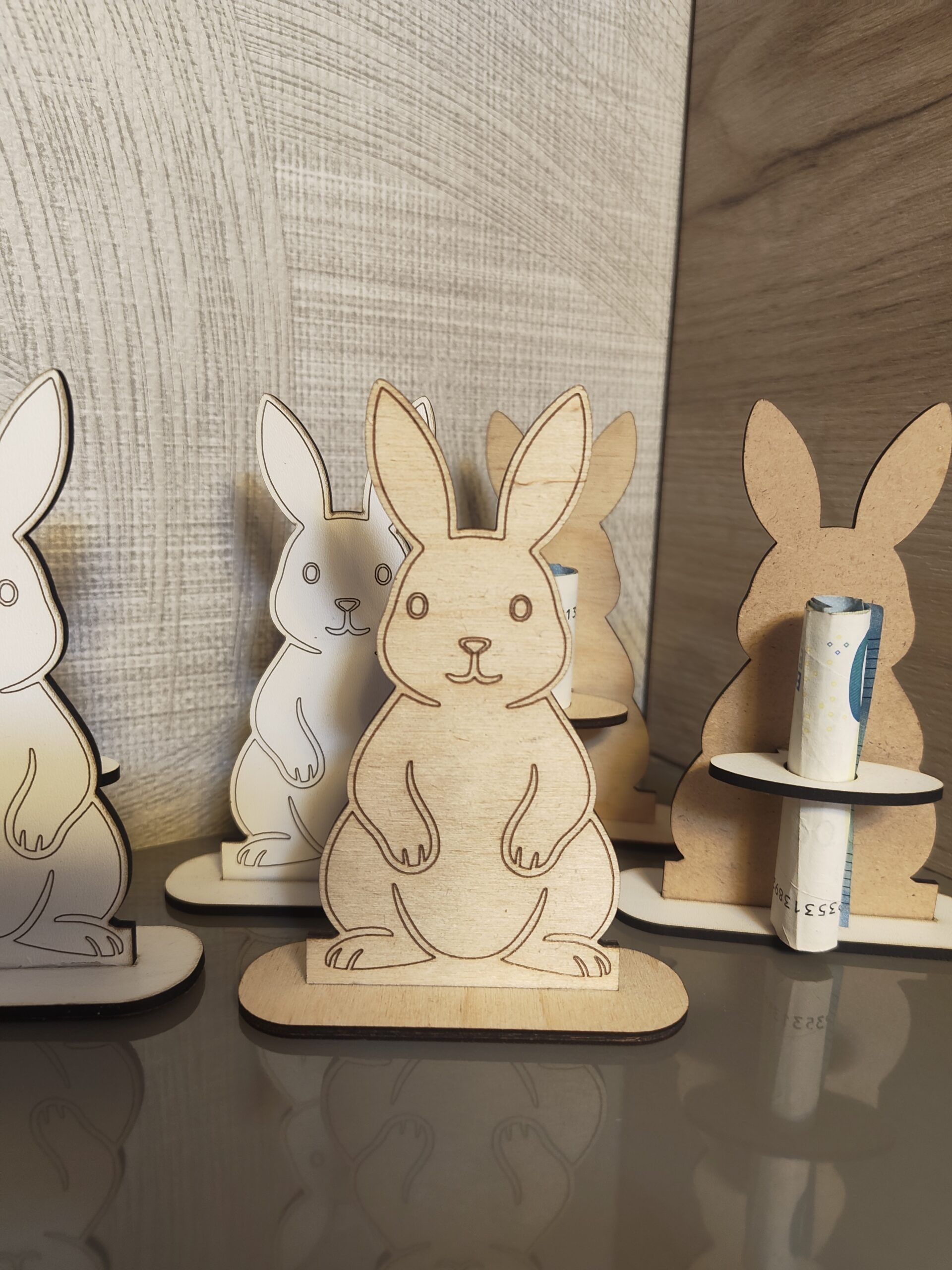 Очарователна великденска украса за маса, изработена от висококачествено дърво с фини лазерни детайли. Декоративните зайчета и пиленца стоят стабилно изправени и са оформени с нежни гравюри, които подчертават празничния им характер. Част от фигурките имат място за поставяне на навита банкнота или малък свитък, което ги превръща в оригинален начин за поднасяне на подарък за Великден.
